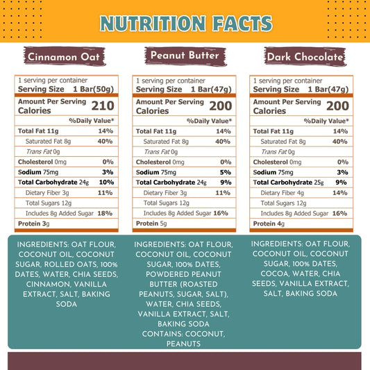 Our Ziggy Bars are made from a mix of wholesome ingredients, including oats, coconut oil, dates, coconut sugar, chia seeds, cinnamon, vanilla extract, salt, and baking soda. In our chocolate variety, we blend in cocoa, while our peanut butter variant is enriched with real peanut butter.*