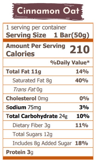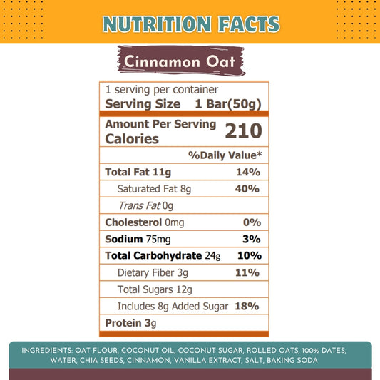 INGREDIENTS: OAT FLOUR, COCONUT OIL, COCONUT SUGAR, ROLLED OATS, 100% DATES, WATER, CHIA SEEDS, CINNAMON, VANILLA EXTRACT, SALT, BAKING SODA