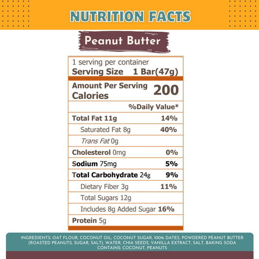 INGREDIENTS: OAT FLOUR, COCONUT OIL, COCONUT SUGAR, 100% DATES, POWDERED PEANUT BUTTER (ROASTED PEANUTS, SUGAR, SALT), WATER, CHIA SEEDS, VANILLA EXTRACT, SALT, BAKING SODA