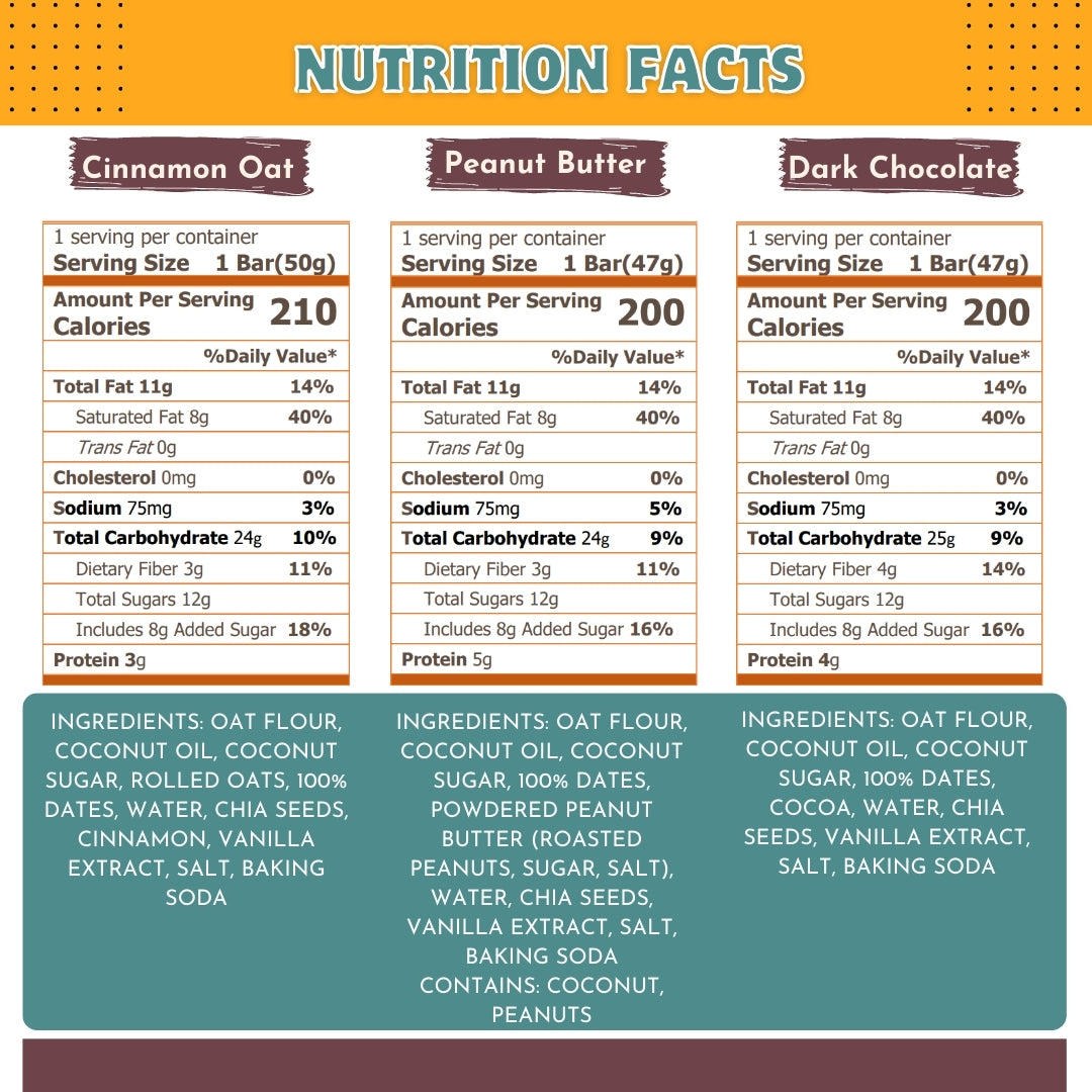 INGREDIENTS: OAT FLOUR, COCONUT OIL, COCONUT SUGAR, ROLLED OATS, 100% DATES, WATER, CHIA SEEDS, CINNAMON, VANILLA EXTRACT, SALT, BAKING SODA