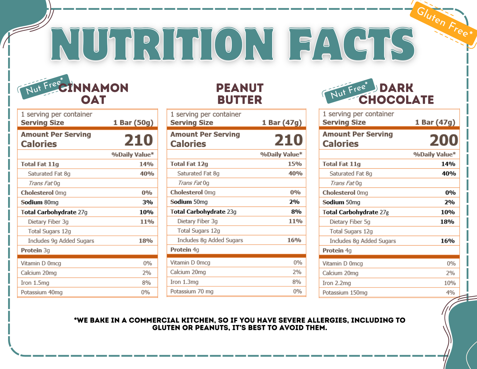 INGREDIENTS: OAT FLOUR, COCONUT OIL, COCONUT SUGAR, ROLLED OATS, 100% DATES, WATER, CHIA SEEDS, CINNAMON, VANILLA EXTRACT, SALT, BAKING SODA